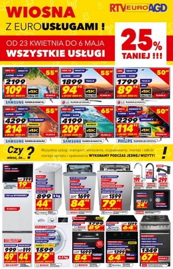 'Wiosna z EuroUsługami' - nowa gazetka promocyjna RTV EURO AGD. Wszystkie usługi 25% taniej. Polecane promocje z gazetki RTV EURO AGD: Telewizor 4K Ultra HD 55 cali Samsung UE55NU7102 - 2199 zł. Kuchenka mikrofalowa Samsung MG23J5133AT - 399 zł. …