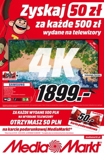 {loadposition linkMediaMarkt} 'Zyskaj 50 zł za każde 500 zł wydane na telewizory' - nowa gazetka promocyjna Media Markt. Polecane promocje z gazetki Media Markt: Telewizor 4K Ultra HD 50 cali SAMSUNG UE50NU7022K - 1899 zł. Telewizor 4K Ultra HD…