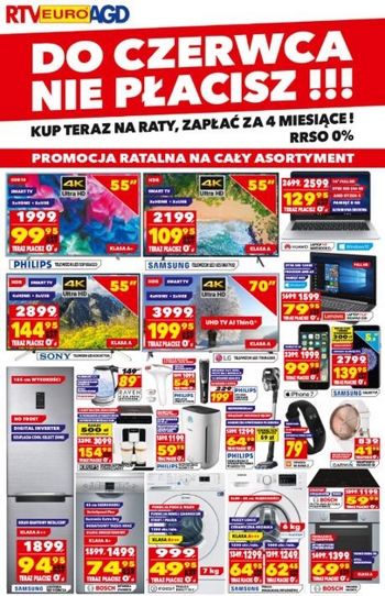 'Do czerwca nie płacisz!!! Kup teraz na raty, zapłać za 4 miesiące! RRSO 0%' - nowa gazetka promocyjna RTV EURO AGD. Polecane promocje z gazetki RTV EURO AGD: Telewizor 4K Ultra HD 55 cali Samsung UE55NU7102 - 1999 zł.…