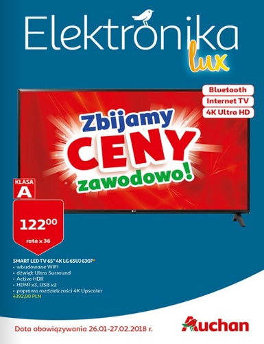 {loadposition linkAuchan} Nowa gazetka promocyjna sieci marketów Auchan - "Elektronika lux". Polecane promocje z gazetki Auchan: Telewizor 4K Ultra HD 65 cali LG 65UJ6307 - 4392 zł. Telewizor 4K Ultra HD 65 cali Philips 65PUS6521 - 5220 zł. Telewizor…