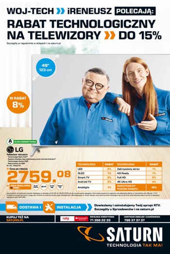 {loadposition linkMediaMarkt} 'Rabat technologiczny na telewizory do 15%' - nowa gazetka promocyjna Saturn. Polecane promocje z gazetki Saturn: Telewizor 4K Ultra HD 49 cali LG 49SJ800V - 2759,08 zł. Telewizor LED 32 cale TOSHIBA 32W3733DG - 854,05 zł. …