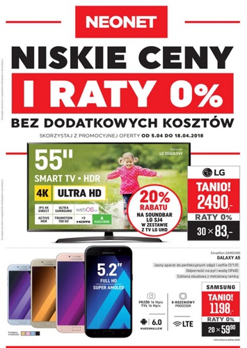 {loadposition linkNeonet} 'Niskie ceny i raty 0% bez dodatkowych kosztów' - nowa gazetka promocyjna Neonet. Polecane promocje z gazetki Neonet: Telewizor 4K Ultra HD 55 cali LG 55UJ634V - 2490 zł*. Smartfon Samsung Galaxy A5 - 1198 zł. Telewizor 4K…