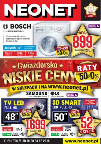 {loadposition linkNeonet} Nowa gazetka promocyjna Neonet - "Raty 0% na cały asortyment". Polecane promocje z gazetki Neonet: Telewizor LED 3D 55" LG 55LF652V - 3060 zł. Smartfon Samsung Galaxy J5 - 729 zł. Telewizor LED 40" Philips 40PFH4100/88 -…
