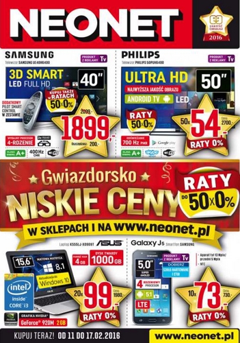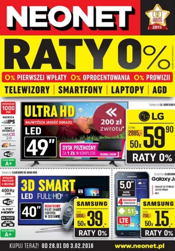 {loadposition linkNeonet} Nowa gazetka promocyjna Neonet - "Raty 0%". Polecane promocje z gazetki Neonet: Telewizor 4k Ultra HD 49" LG 49UF680V - 2995 zł. Telewizor LED 3D 40" SAMSUNG UE40H6400 - 1950 zł. Smartfon SAMSUNG J500 Galaxy J5 LTE…