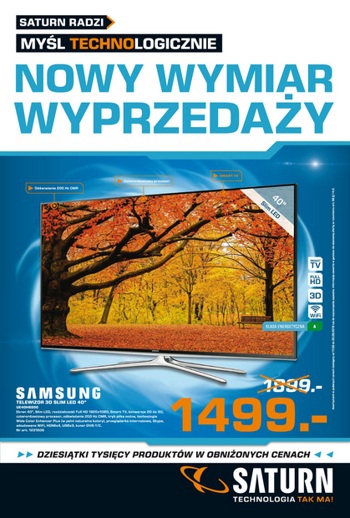 {loadposition linkMediaMarkt} Nowa gazetka promocyjna Saturn - "Nowy wymiar wyprzedaży". Polecane promocje z gazetki Saturn: Telewizor LED 3D 40" SAMSUNG UE40H6200AW - 1499 zł Telewizor LED 3D 55" LG 55LB670V - 2799 zł Telewizor LED 32" SHARP LC-32LD170E -…