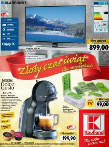 {loadposition linkKaufland} Nowa gazetka promocyjna marketu Kaufland - "Złoty czas świąt dla wszystkich". Polecane promocje z gazetki Kaufland: Telewizor LED 40" Blaupunkt - 899 zł. Ekspres do kawy Nescafe Dolce Gusto Mini Me - 199,90 zł. Szatkownica Nicer…