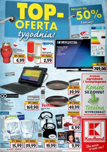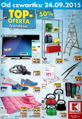 {loadposition linkKaufland} Nowa gazetka promocyjna marketu Kaufland - "TOP-Oferta tygodnia!". Polecane promocje z gazetki Kaufland: Telewizor LED 32" Blaupunkt - 749 zł. Aluminiowa drabina wielofunkcyjna - 179,90 zł. Latarka czołowa - 9,99 zł. Oferta ważna od 24.09 do…