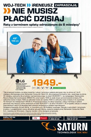 {loadposition linkMediaMarkt} Nowa gazetka promocyjna Saturn - "Nie musisz płacić dzisiaj". Polecane promocje z gazetki Saturn: Telewizor LED 43 cale LG 43UJ6307 - 1949 zł. Telewizor LED 49 cali PHILIPS 49PFS5302/12 - 2199 zł. Telewizor 4K Ultra HD 49…