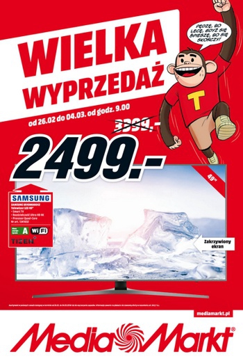 {loadposition linkMediaMarkt} 'Wielka wyprzedaż. Pędzę, bo lecę, gdyż się śpieszę, bo się skończy!' - nowa gazetka promocyjna Media Markt. Polecane promocje z gazetki Media Markt: Telewizor 4K Ultra HD 49 cali SAMSUNG UE49MU6642U - 2499 zł. Telewizor LED 32…