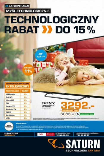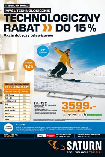 {loadposition linkMediaMarkt} Nowa gazetka promocyjna Saturn - "Technologiczny rabat do 15%". Polecane promocje z gazetki Saturn: Telewizor LED 50" SONY KDL-50W807C - 3167 zł Telewizor LED 43" LG 43LF510V - 1424 zł Telewizor LED 48" SAMSUNG UE48J5600 - 2231…