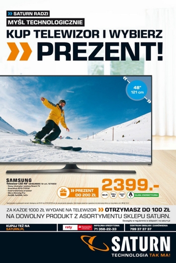 {loadposition linkMediaMarkt} Nowa gazetka promocyjna Saturn - "Kup telewizor i wybierz prezent!". Polecane promocje z gazetki Saturn: Telewizor LED 48" SAMSUNG UE48J5600 - 2399 zł Telewizor LED 50" PANASONIC TX-50CS630E - 2799 zł Telewizor LED 49" SONY KD-49X8005C -…