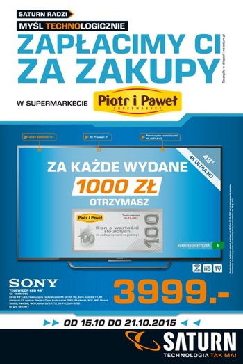 {loadposition linkMediaMarkt} Nowa gazetka promocyjna Saturn - "Zapłacimy Ci za zakupy w supermarkecie Piotr i Paweł". Polecane promocje z gazetki Saturn: Telewizor LED 49" SONY KD-49X8005C - 3999 zł Telewizor LED 43" LG 43LF632V - 1999 zł Smartfon APPLE…