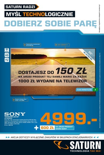 {loadposition linkMediaMarkt} Nowa gazetka promocyjna Saturn - "50 rat 0%". Polecane promocje z gazetki Saturn: Telewizor LED 55" LG 55LF652V - 3149 zł Telewizor LED 55" Sony KDL-55W807C - 4799 zł Smartfon Samsung Galaxy S6 - 2299 zł …