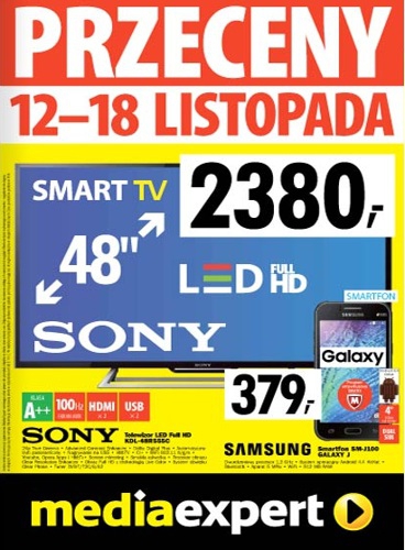 {loadposition linkMediaExpert} Nowa gazetka promocyjna Media Expert - "Przeceny!". Polecane promocje z gazetki Media Expert: Telewizor LED 48" SONY KDL-48R555C - 2380 zł. Smartfon SAMSUNG GALAXY J SM-J100 - 379 zł. Telewizor LED 32" PHILIPS 32PFH4200 - 899 zł.…
