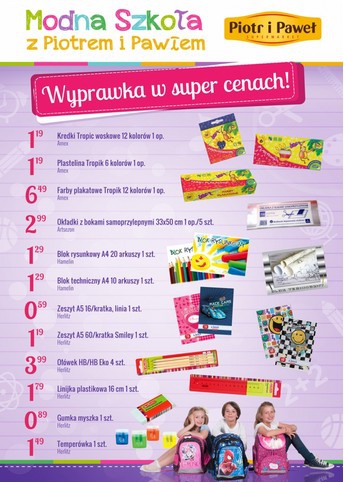 Nowa gazetka promocyjna sieci sklepów Piotr i Paweł - "Wyprawka w super cenach!". Polecane promocje z gazetki Piotr i Paweł: Kredki woskowe 12 kolorów - 1,19 zł. Farby plakatowe Tropik 12 kolorów - 6,49 zł. Temperówka Herlitz -…