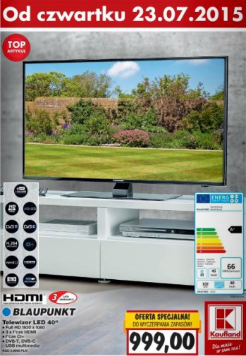 {loadposition linkKaufland} Nowa gazetka promocyjna marketu Kaufland - "TOP-Artykuł". Polecane promocje z gazetki Kaufland: Telewizor LED 40" Blaupunkt - 999 zł. Tenisówki damskie - 14,99 zł. Japonki damskie - 5,99 zł. Oferta ważna od 23.07 do wyczerpania zapasów.