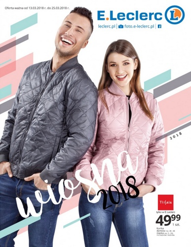 {loadposition linkEleclerc} 'Wiosna 2018' - nowa gazetka promocyjna sieci handlowej E.Leclerc. Polecane promocje z gazetki E.Leclerc: Kurtka damska lub męska Tissaia - 49,99 zł. Tenisówki damskie Tissaia - 34,99 zł. Top damski Tissaia - 14,99 zł. Oferta…