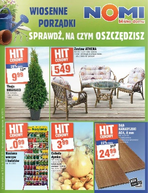 Nowa gazetka promocyjna Nomi - "Sprawdź, na czym oszczędzisz". Polecane promocje z gazetki Nomi: Thuja smaragd - 9,99 zł. Nasiona warzyw i kwiatów - od 0,99 zł. Cebula dymka 500 g - 3,99 zł. Oferta ważna od…