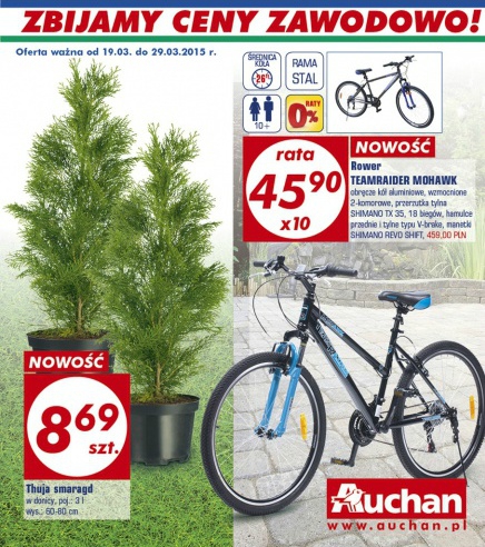 {loadposition linkAuchan} Nowa gazetka promocyjna Auchan. Polecane promocje z gazetki Auchan: Rower Teamraider Mohawk - 459 zł. Thuja smaragd - 8,69 zł. Borówka amerykańska w donicy - 6,39 zł. Oferta ważna od 19.03 do 29.03.