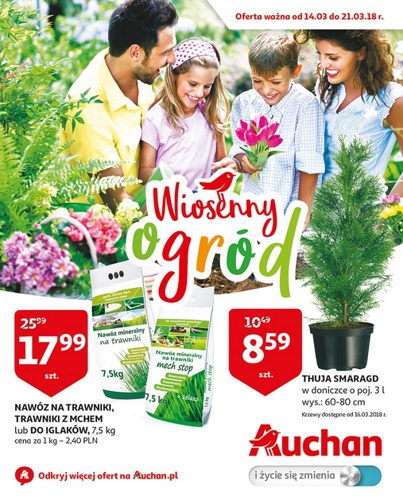 {loadposition linkAuchan} 'Wiosenny ogród' - nowa gazetka promocyjna sieci marketów Auchan. Polecane promocje z gazetki Auchan: Nawóz różne rodzaje 7,5 kg - 17,99 zł. Thuja smaragd - 8,59 zł. Krzew azalii japońskiej w doniczce - 7,99 zł. …