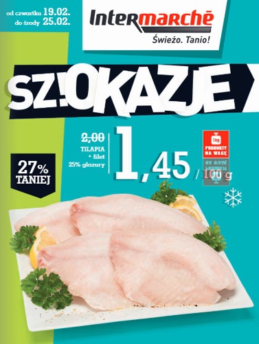 {loadposition linkIntermarche} Nowa gazetka promocyjna sieci handlowej Intermarche - "Sz!okazje". Polecane promocje z gazetki Intermarche: Tilapia filet 100 g - 1,45 zł. Płyn do mycia naczyń Ludwik 1 kg - 3,99 zł. Pasta do zębów Elmex Sensitive 75 ml…