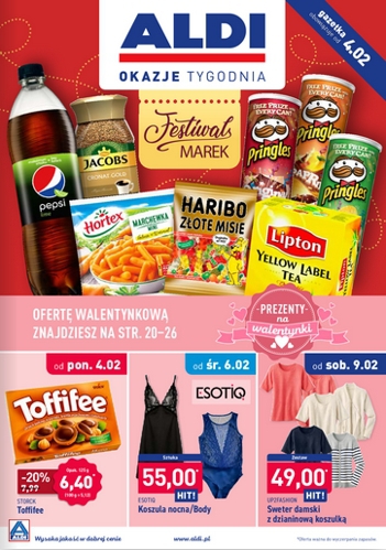 {loadposition linkAldi} 'Festiwal marek' - nowa gazetka promocyjna Aldi. Polecane promocje z gazetki Aldi: Toffifee 125 g - 6,49 zł. Body lub koszula nocna Esotiq - 55 zł. Sweter damski z dzianionową koszulką Up2fashion - 49 zł. …