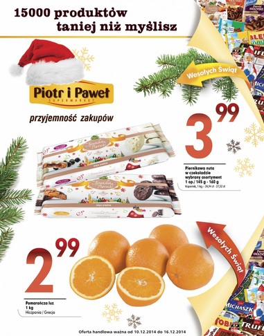 Nowa gazetka promocyjna sieci sklepów Piotr i Paweł - "15 000 produktów taniej niż myślisz". Polecane promocje z gazetki Piotr i Paweł: Pomarańcze 1 kg - 2,99 zł. Żelki Haribo 200 g - 4,49 zł. Torcik Wedlowski 250…