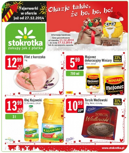 Nowa gazetka promocyjna sieci handlowej Stokrotka. Polecane promocje z gazetki Stokrotka: Filet z kurczaka 1 kg - 12,99 zł. Olej Kujawski 3 L - 13,99 zł. Torcik Wedlowski 250 g - 10,99 zł. Oferta ważna od 11.12…