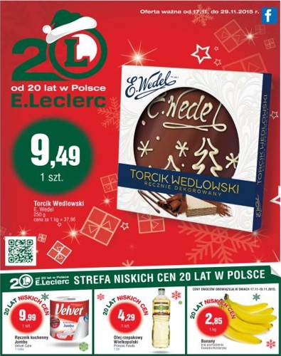 {loadposition linkEleclerc} 'Świątecznych pomysłów bez liku!' - nowa gazetka promocyjna sieci handlowej E.Leclerc. Polecane promocje z gazetki E.Leclerc: Torcik Wedlowski Wedel 250 g - 9,99 zł. Mąka puszysta Lubella 1 kg - 1,99 zł. Margaryna Benecol 400 g…
