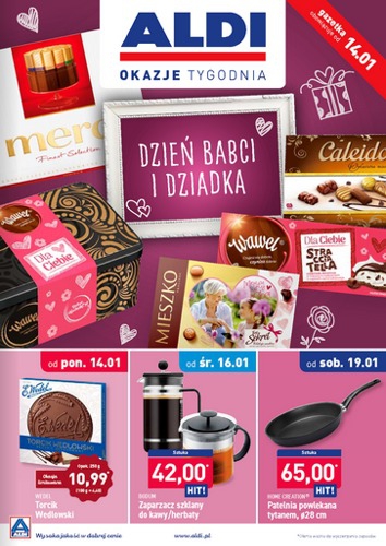 {loadposition linkAldi} 'Dzień Babci i Dziadka'- nowa gazetka promocyjna Aldi. Polecane promocje z gazetki Aldi: Torcik Wedlowski 250 g - 10,99 zł. Zaparzacz szklany do kawy lub herbaty Bodum - 42 zł. Patelnia powlekana tytanem Home Creation -…