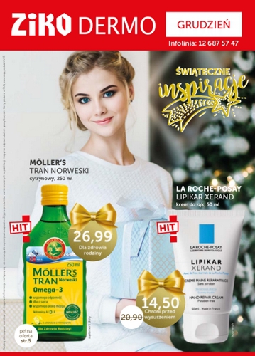Nowa gazetka promocyjna drogerii Ziko Dermo - "Świąteczne inspiracje". Polecane promocje z gazetki Ziko Dermo: Tran norewski Mollers cytrynowy 250 ml - 26,99 zł. Krem do rąk La Roche-Posay Lipikar Xerand 50 ml - 14,50 zł. Hepatil 80 tabletek…
