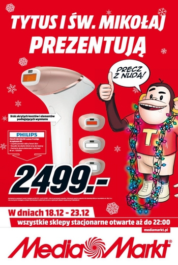 {loadposition linkMediaMarkt} Nowa gazetka promocyjna Media Markt - "Tytus i Św. Mikołaj prezentują". Polecane promocje z gazetki Media Markt: Depilator PHILIPS Lumea Prestige BRI956/00 IPL - 2499 zł. Trymer BABYLISS T839E - 229 zł. Frytownica TEFAL Filtra One Inox…