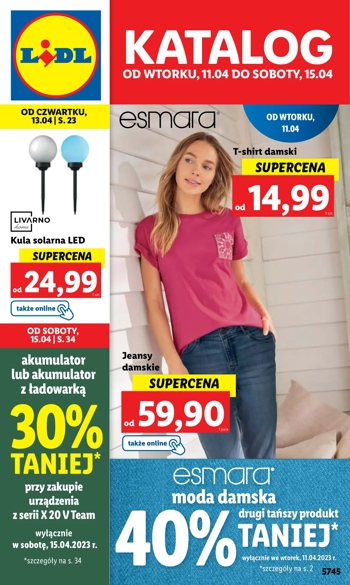 {loadposition linkLidl} Nowa gazetka promocyjna sieci sklepów Lidl. Polecane promocje z gazetki sklepów Lidl: T-shirt damski Esmara - od 14,99 zł*. Jeansy damskie Esmara - od 59,90 zł**. Kula solarna LED Livarno Home - od 24,99 zł***. *…