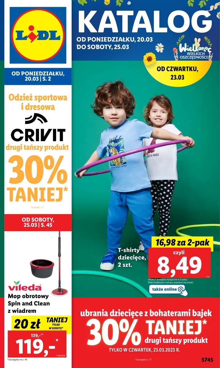 {loadposition linkLidl3} 'Oszczędzaj z Lidlem' - nowa gazetka promocyjna sieci sklepów Lidl. Polecane promocje z gazetki sklepów Lidl: T-shirt dziecięcy 2-pak - 16,98 zł*. Mop obrotowy Vileda Spin and Clean z wiadrem - 119 zł**. Legginsy sportowe damskie Crivit…