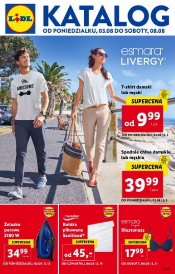 Nowa gazetka promocyjna sieci sklepów Lidl. Polecane promocje z gazetki sklepów Lidl: T-shirt damski Esmara lub męski Livergy - 9,99 zł. Spodnie chino damskie Esmara lub męskie Livergy - 39,99 zł. Żelazko parowe 2180 W - 34,99 zł.…