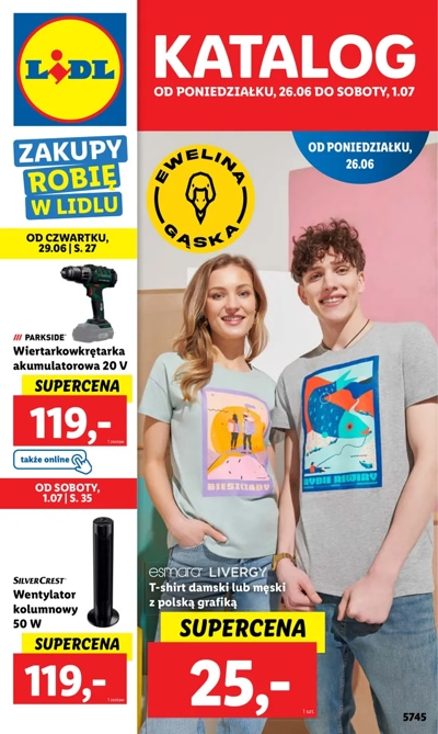 {loadposition linkLidl3} Nowa gazetka promocyjna sieci sklepów Lidl. Polecane promocje z gazetki sklepów Lidl: T-shirt damski Esmara lub męski Livergy - 25 zł*. Wiertarkowkrętarka akumulatorowa Parkside 20 V - 119 zł**. Wentylator kolumnowy SilverCrest 50 W - 119 zł***.…