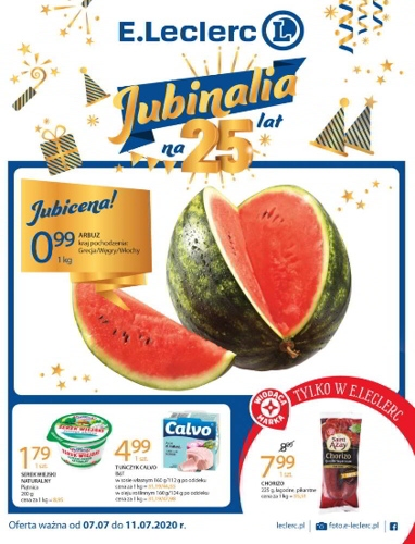 {loadposition linkEleclerc3} 'Jubinalia na 25 lat' - nowa gazetka promocyjna sieci handlowej E.Leclerc. Polecane promocje z gazetki E.Leclerc: Arbuz 1 kg - 0,99 zł. Serek Wiejski Naturalny Piątnica 200 g - 1,79 zł. Tuńczyk Calvo 160 g-…