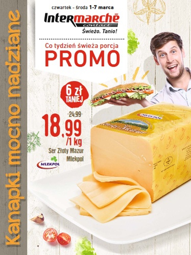 {loadposition linkIntermarche} 'Wielka moc okazji' - nowa gazetka promocyjna sieci sklepów Intermarche. Polecane promocje z gazetki Intermarche: Ser Królewski Sierpc 1 kg - 19,89 zł. Twaróg wiejski Piątnica 250 g - 2,99 zł. Camembert President 120 g -…