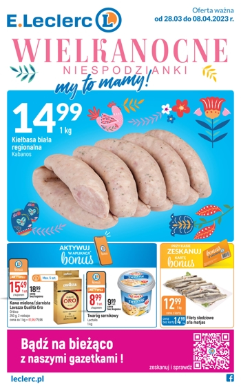 {loadposition linkEleclerc} 'Wielkanocne niespodzianki' - nowa gazetka promocyjna sieci handlowej E.Leclerc. Polecane promocje z gazetki E.Leclerc: Kiełbasa biała regionalna Kabanos 1 kg - 14,99 zł. Kawa mielona lub ziarnista Lavazza Qualita Oro 250 g - 15,49 zł*. Twaróg sernikowy…