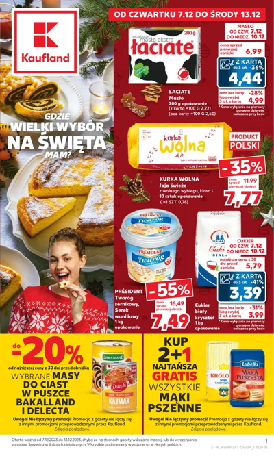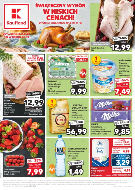 'Świąteczny wybór w niskich cenach!' - nowa gazetka promocyjna sieci marketów Kaufland. Polecane promocje z gazetki Kaufland: Indyk tuszka 1 kg - 12,99 zł. Jaja z chowu ściółkowego Zdrovo klasa M 20 sztuk - 9,99 zł. Twaróg sernikowy President…