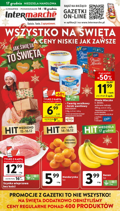'Wszystko na święta, a ceny niskie jak zawsze' - nowa gazetka promocyjna sieci sklepów Intermarche Polecane promocje z gazetki Intermarche: Twaróg sernikowy President 1 kg - 6,99 zł*. Ptasie mleczko Wedel 340 g - 11,99 zł**. Szynka wieprzowa bez…