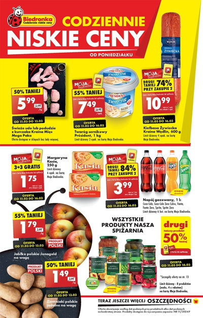 'Codziennie niskie ceny' - nowa gazetka promocyjna sieci sklepów Biedronka. Polecane promocje z gazetki sieci Biedronka: Świeże udo lub podudzie z kurczaka Kraina Mięs 1 kg - 5,99 zł*. Twaróg sernikowy President 1 kg - 7,49 zł**. Kiełbasa Żywiecka…
