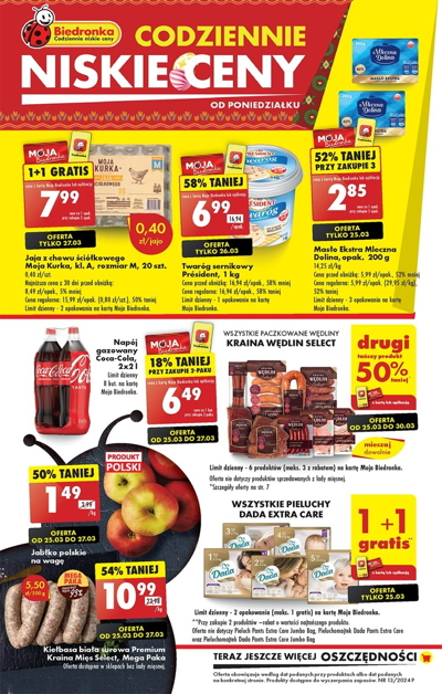 'Codziennie niskie ceny' - nowa gazetka promocyjna sieci sklepów Biedronka. Polecane promocje z gazetki sieci Biedronka: Masło Ekstra Mleczna Dolina 200 g - 2,85 zł*. Twaróg sernikowy President 1 kg - 6,99 zł. Jaja z chowu ściółkowego Moja Kurka…