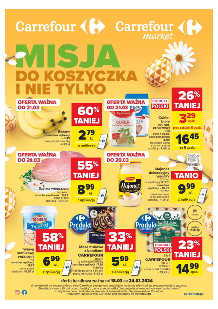 'Misja do koszyczka i nie tylko' - nowa gazetka promocyjna sieci marketów Carrefour. Polecane promocje z gazetki Carrefour: Szynka wieprzowa bez kości 1 kg - 8,99 zł*. Majonez dekoracyjny Winiary 700 ml - 9,99 zł*. Twaróg sernikowy President 1…