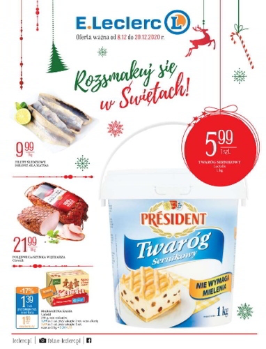 {loadposition linkEleclerc} 'Rozsmakuj się w Świętach!' - nowa gazetka promocyjna sieci handlowej E.Leclerc. Polecane promocje z gazetki E.Leclerc: Filety śledziowe solone a'la matias 1 kg - 9,99 zł. Szynka wędzarza Olewnik 1 kg - 21,99 zł. Twaróg sernikowy President…