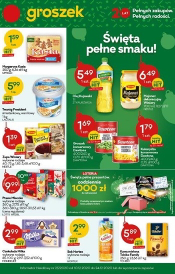 {loadposition linkGroszek} 'Święta pełne smaku!' - nowa gazetka promocyjna sieci sklepów Groszek. Polecane promocje z gazetki Groszek: Olej Kujawski 1 L - 5,49 zł. Majonez dekoracyjny Winiary 700 ml - 6,49 zł. Twaróg sernikowy President 1 kg - 5,99…