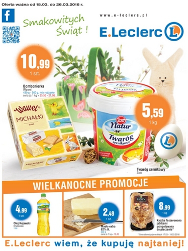 {loadposition linkEleclerc} Nowa gazetka promocyjna sieci handlowej E.Leclerc - "Wielkanocne promocje!". Polecane promocje z gazetki E.Leclerc: Bombonierka Wawel różne rodzaje - 10,99 zł. Twaróg sernikowy Zott 1 kg - 5,59 zł. Olej Kujawski 1 L - 4,99 zł. …