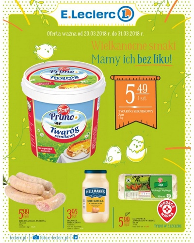 {loadposition linkEleclerc} 'Wielkanocne smaki. Mamy ich bez liku!' - nowa gazetka promocyjna sieci handlowej E.Leclerc. Polecane promocje z gazetki E.Leclerc: Twaróg sernikowy Zott 1 kg - 5,49 zł. Kiełbasa biała parzona Olewnik 420 g - 5,99 zł. Jaja od…