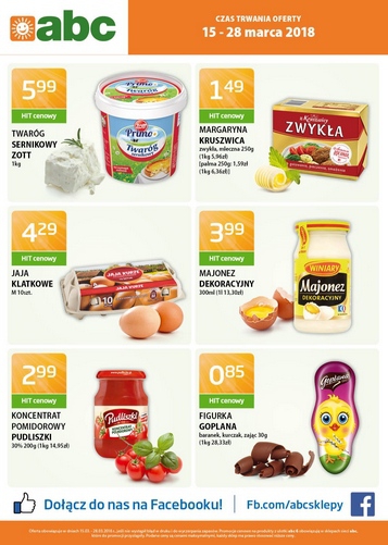 Nowa gazetka promocyjna sieci sklepów ABC. Polecane promocje z gazetki ABC: Twaróg sernikowy Zott 1 kg - 5,99 zł. Margaryna Kruszwica 250 g - 1,49 zł. Jajka klatkowe klasa M 10 sztuk - 4,29 zł. …