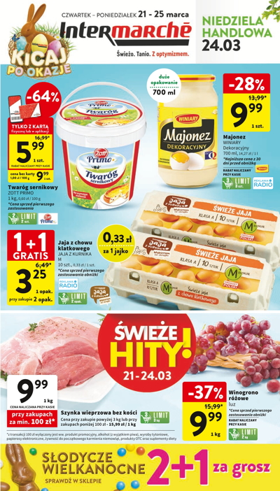 'Kicaj po okazje' - nowa gazetka promocyjna sieci sklepów Intermarche Polecane promocje z gazetki Intermarche: Majonez dekoracyjny Winiary 700 ml - 9,99 zł. Twaróg sernikowy Zott Primo 1 kg - 5,99 zł*. Jaja z chowu klatkowego Jaja Z Kurnika…